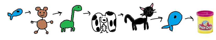 De esa explosión, salió una célula que evolucionó convirtiéndose a su vez en pez, luego en oso, en dinosaurio, en perro, en gato, en pez otra vez, hasta que acabó convirtiéndose en un bote de plastilina.